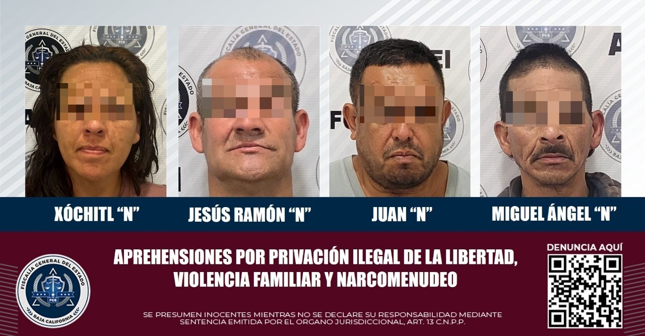 TIJUANA, B.C. La Fiscalía General del Estado, a través de la Agencia Estatal de Investigación (AEI), cumplimentó cuatro órdenes de aprehensión en contra de tres hombres y una mujer, quienes eran requeridos por los jueces de control del partido judicial de Tijuana.
