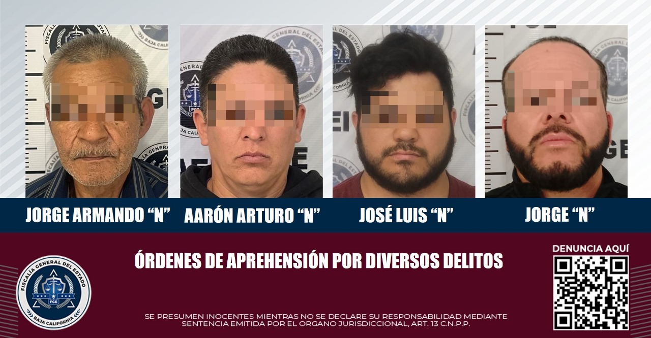 TIJUANA, B.C. La Fiscalía General del Estado (FGE), a través de agentes estatales de investigación, cumplimentó órdenes de aprehensión contra de cuatro individuos señalados en distintos expedientes penales por robo de vehículo, violencia familiar, robo calificado y pederastia.