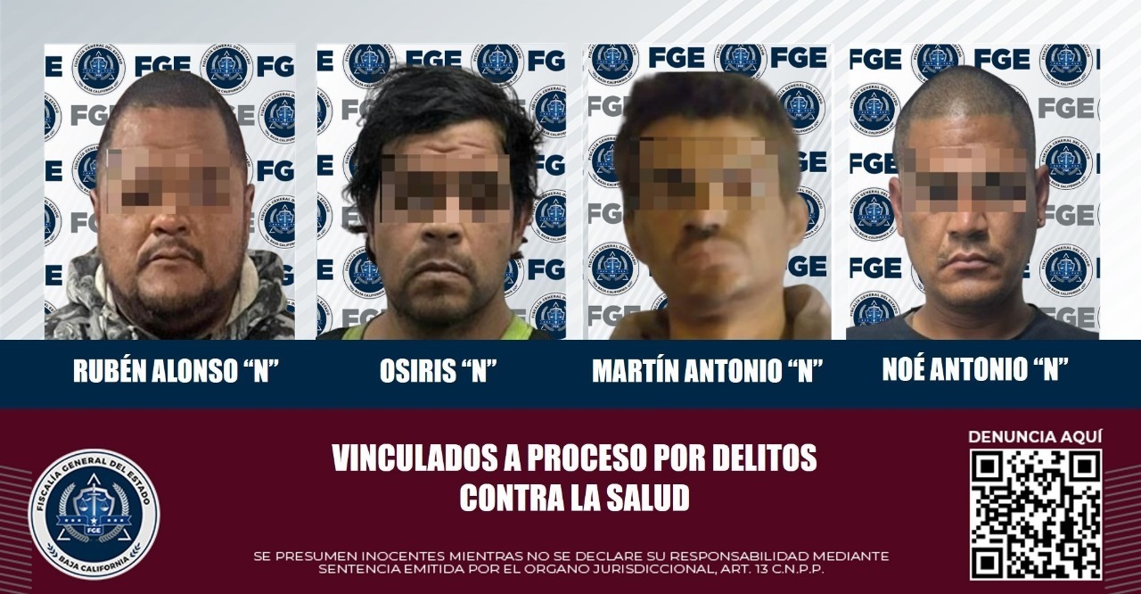 TIJUANA, B.C. En audiencias de vinculación a proceso llevadas a cabo de manera independiente, la Fiscalía General del Estado informa que cuatro personas acusadas del delito contra la salud en la modalidad de narcomenudeo han quedado sujetas a proceso penal.