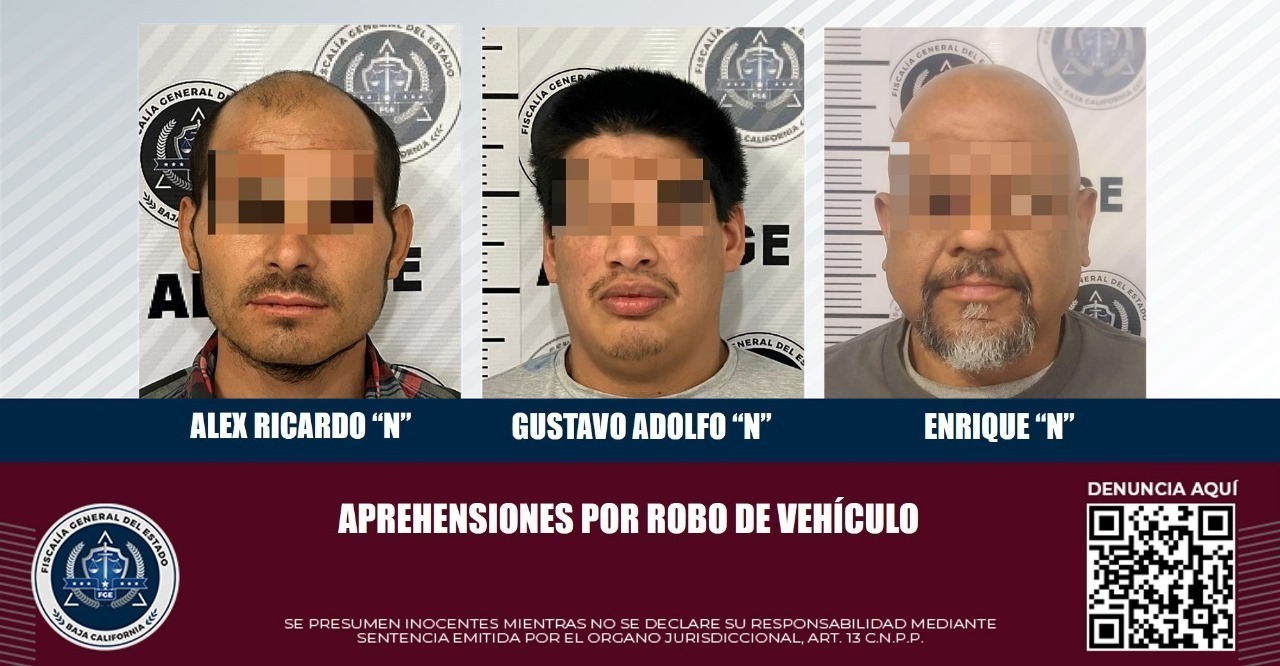 TIJUANA, B.C. La Fiscalía General del Estado, a través de la Agencia Estatal de Investigación (AEI) de la Zona Tijuana, logró la detención de tres imputados, por hechos relacionados con el delito de robo de vehículos.