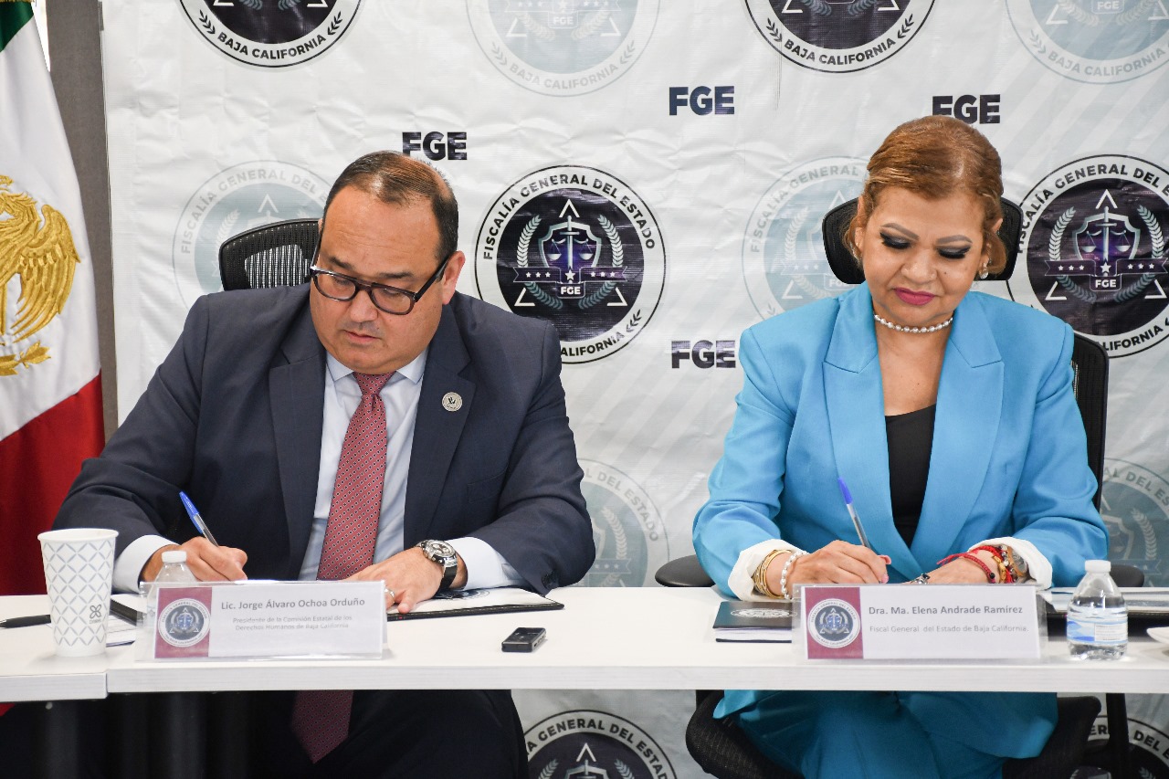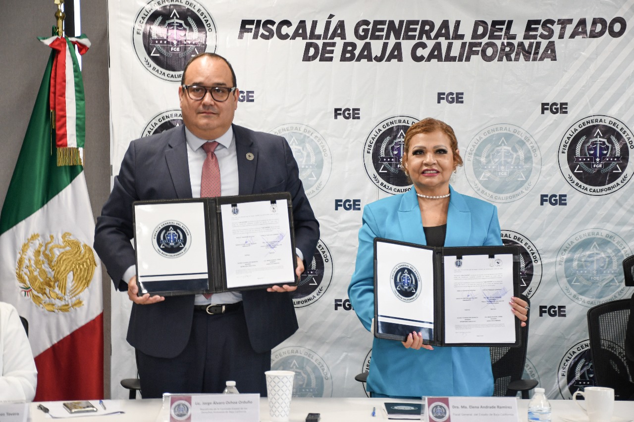 TIJUANA, B.C. La Fiscal General del Estado, Dra. Ma. Elena Andrade Ramírez, encabezó hoy la firma de un convenio de colaboración con la Comisión Estatal de Derechos Humanos, representada por su presidente Jorge Álvaro Ochoa Orduño.