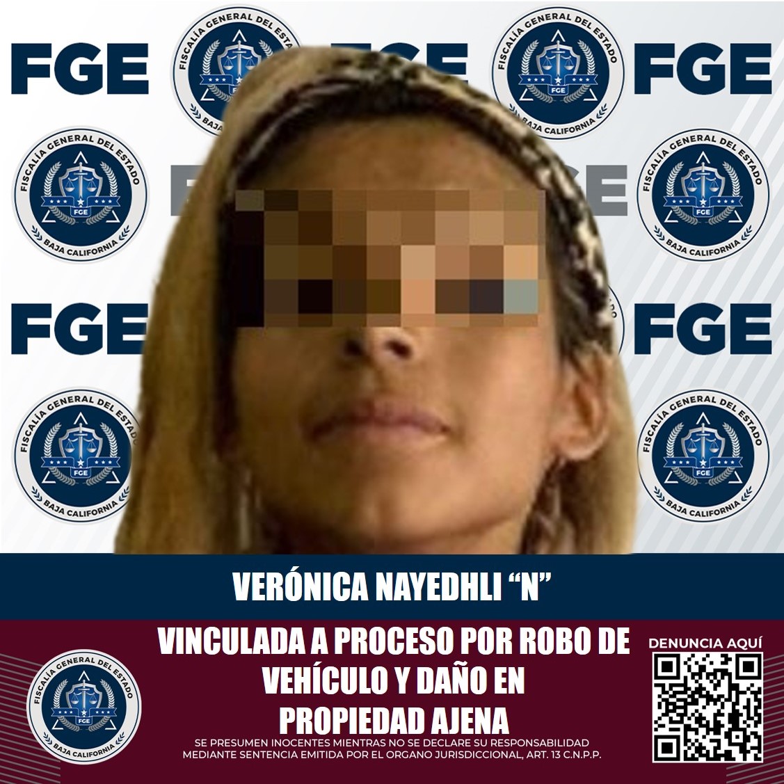 TIJUANA, B.C. La Fiscalía General del Estado (FGE), a través del Ministerio Público, logró la vinculación a proceso de una mujer acusada por los delitos de robo de vehículo de motor y daño en propiedad ajena.