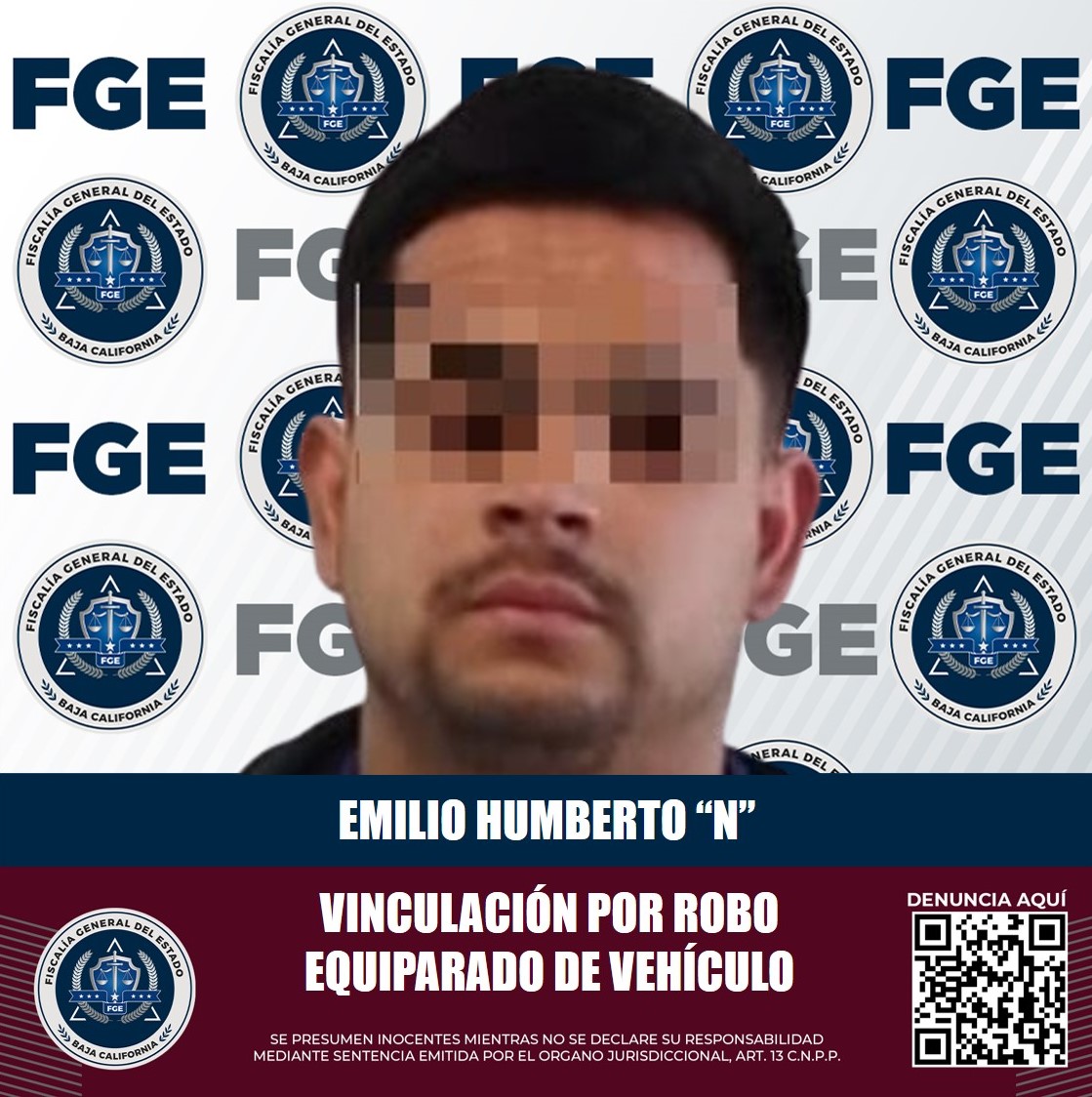 TECATE, B.C. A través de diversos elementos de prueba presentados por la Fiscalía Regional de Tecate ante un Juez de Control, se logró la vinculación a proceso de Emilio Humberto "N", acusado del delito de robo equiparado de vehículo de motor en su modalidad de uso de vehículo de motor robado.