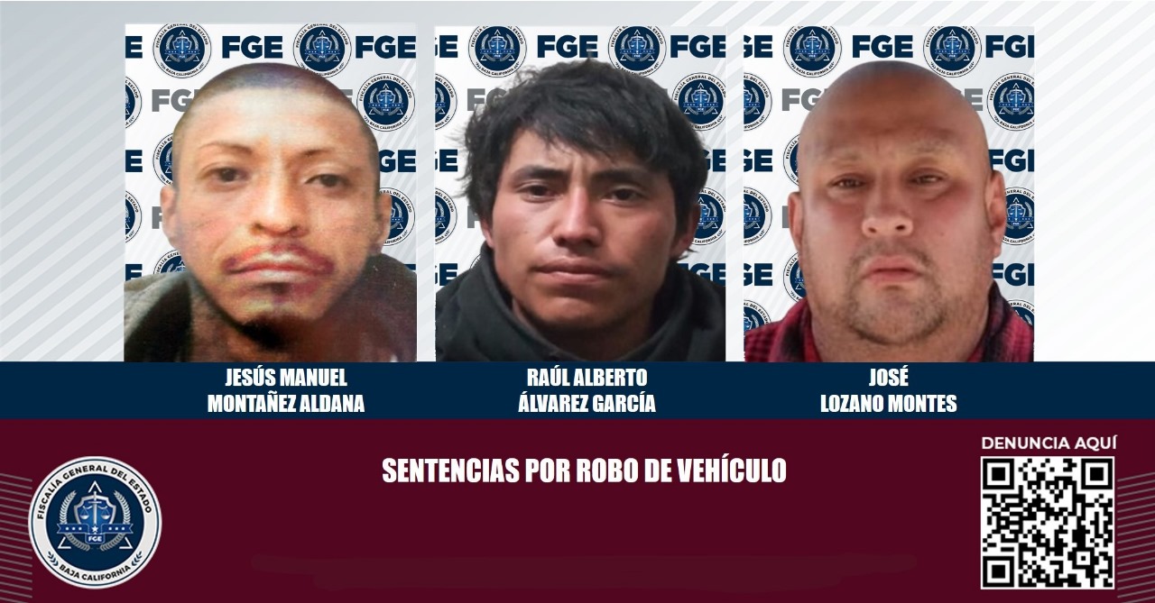TIJUANA, B.C. Tres individuos responsables del delito de robo equiparado de vehículo de motor fueron sentenciados en audiencias separadas, luego de que la Fiscalía Regional de Tijuana presentara los elementos de prueba ante la autoridad judicial.