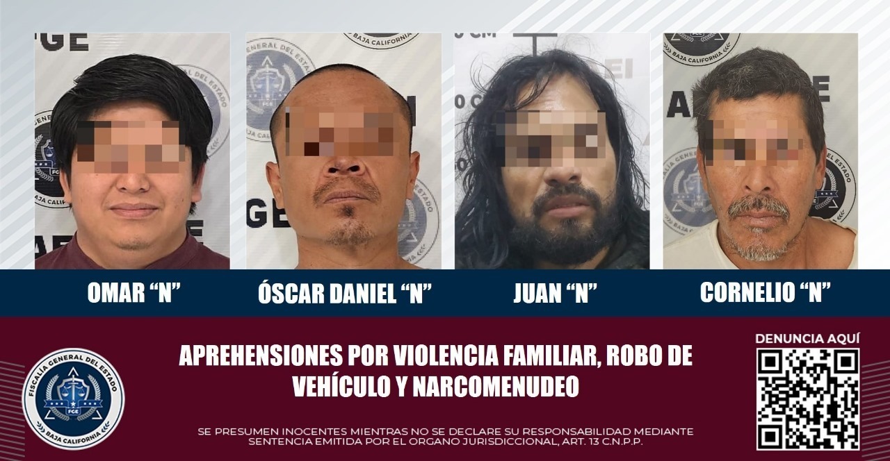 TIJUANA, B.C. La Fiscalía General del Estado, a través de la Agencia Estatal de Investigación, ha logrado la captura de cuatro individuos con órdenes de aprehensión emitidas por jueces de control en Tijuana, por su presunta participación en delitos como violencia familiar, robo de vehículo y narcomenudeo.