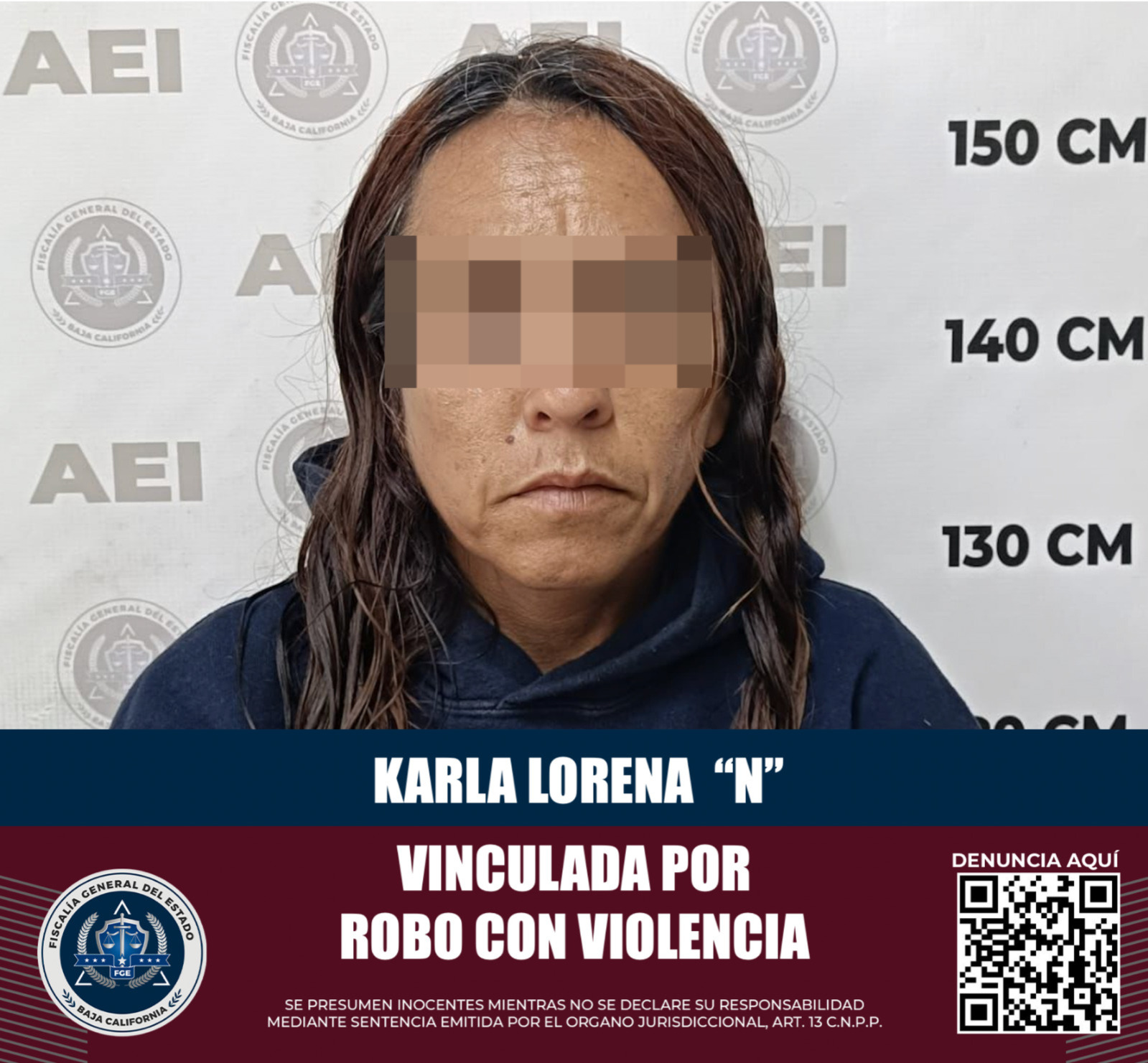 ENSENADA, B.C. La Fiscalía Regional de Ensenada, gracias a una efectiva investigación, logró auto de vinculación a proceso en contra de una mujer presuntamente implicada en un robo con violencia cometido en la colonia Lomitas.