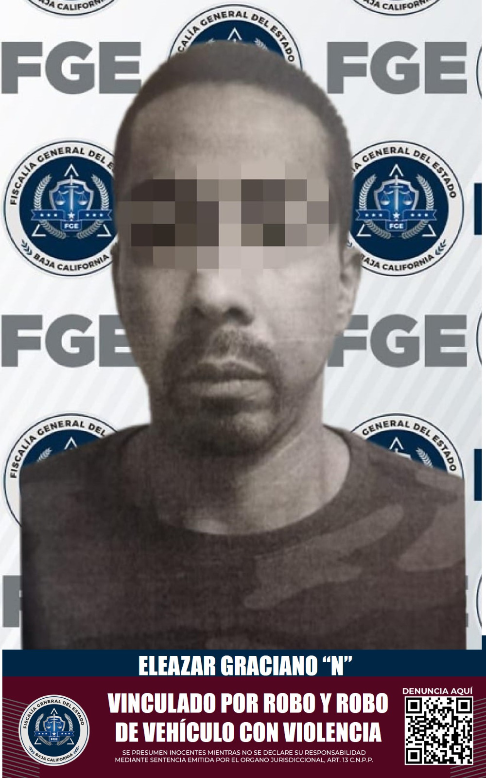 MEXICALI, B.C. La Fiscalía Regional de Mexicali, a través de la Unidad de Investigación de Robos Oriente, obtuvo auto de vinculación a proceso en contra de Eleazar Graciano “N”, por su probable responsabilidad en el delito de robo calificado cometido de noche por dos o más personas con violencia y robo de vehículo con violencia.