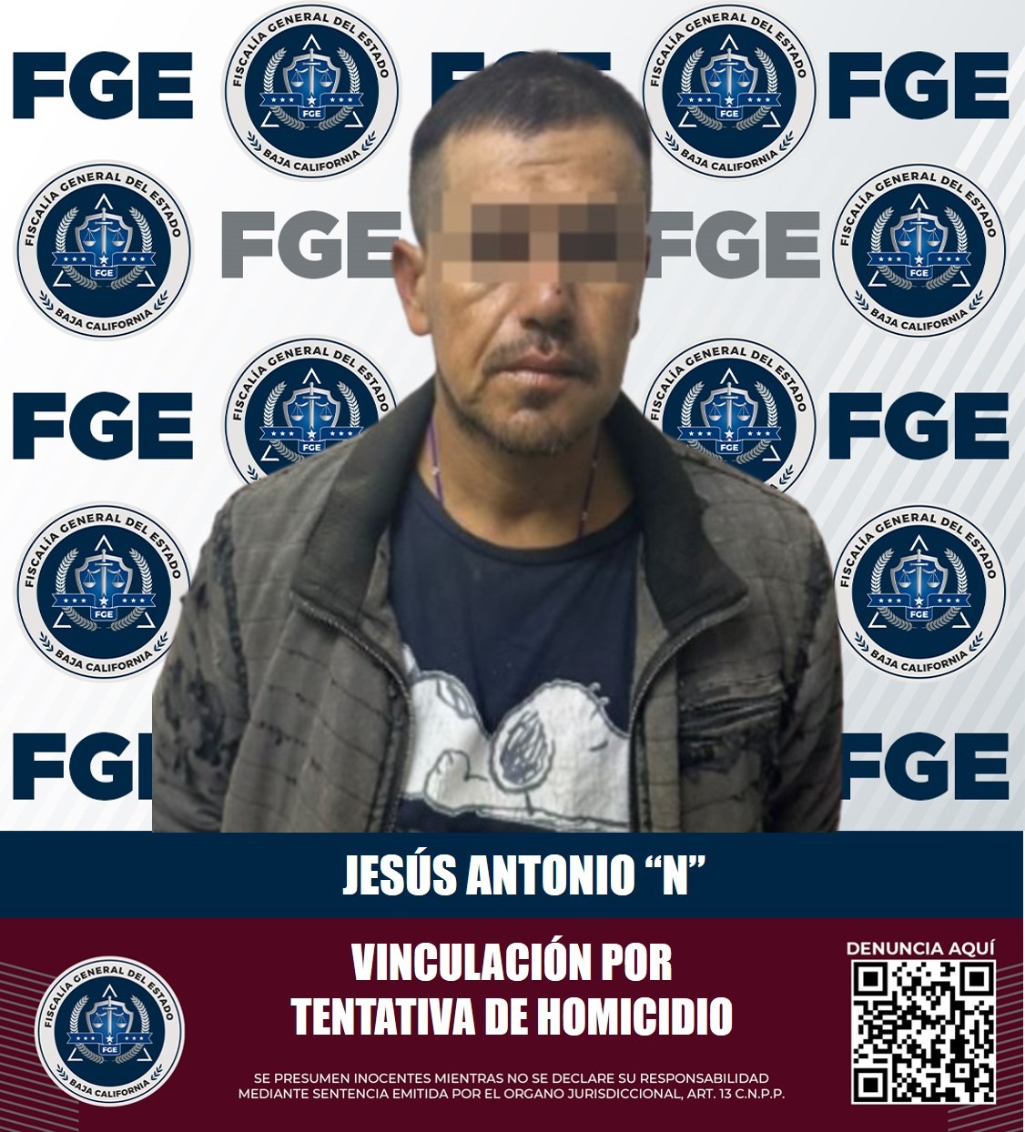 TECATE, B.C. La Fiscalía Regional de Tecate informa que, con los datos de prueba aportados por el Ministerio Público de la Unidad de Investigación de Delitos Contra las Personas y su Libertad, se logró vincular a proceso a Jesús Antonio "N" por el delito de homicidio calificado en grado de tentativa con ventaja.