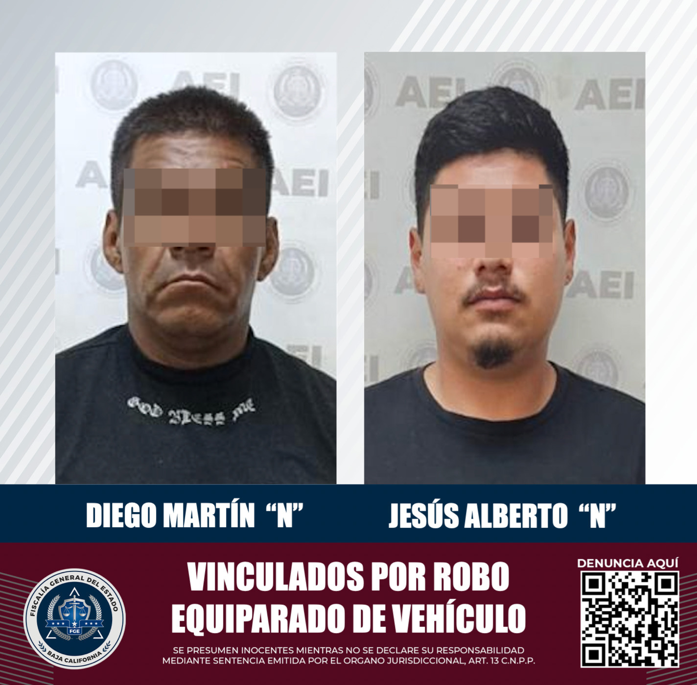 ENSENADA, B.C. La Fiscalía Regional de Ensenada, a través del agente del Ministerio Público, logró el inicio de proceso penal contra dos individuos por robo equiparado de vehículo; uno de los detenidos, con antecedentes penales, continuará en prisión preventiva.