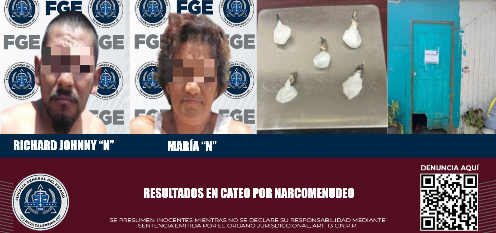 ENSENADA, B.C. Resultado de acciones contra el narcomenudeo en la región, la Fiscalía General del Estado arrestó a dos personas e incautó droga tras ejecutar una orden de cateo en un domicilio de la colonia Márquez de León.