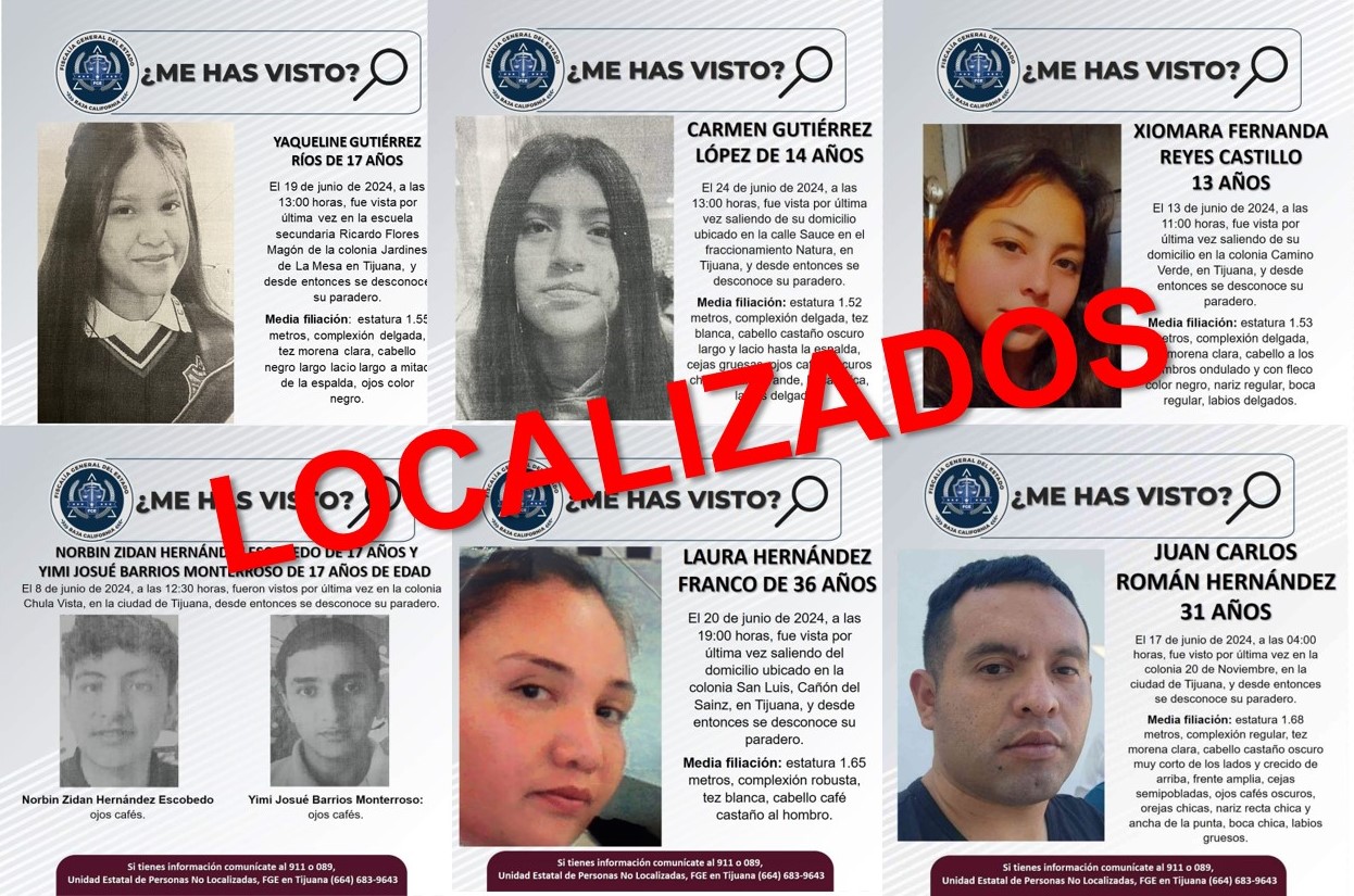 TIJUANA, B.C. Elementos de la Fiscalía General del Estado han localizado a siete personas que habían sido reportadas como desaparecidas, siendo cinco menores y dos adultos, quienes fueron encontradas en buen estado de salud.