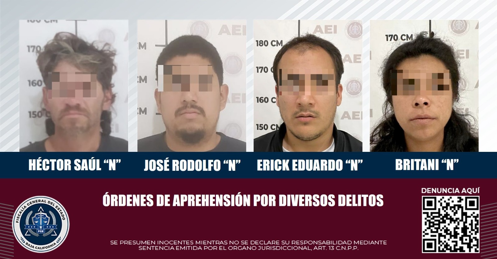 PLAYAS DE ROSARITO, B.C. La Fiscalía General del Estado informa sobre la detención de cuatro personas, tres hombres y una mujer, como resultado de la labor de elementos de la Agencia Estatal de Investigación (AEI).