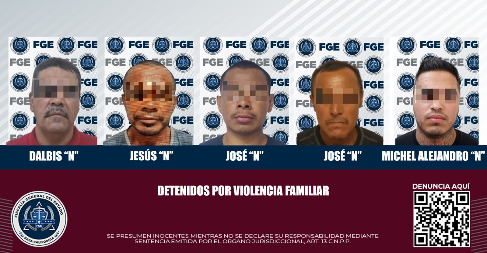 MEXICALI, B.C. Uno de los objetivos de la Fiscalía General del Estado (FGE) es investigar y perseguir los delitos relacionados con hechos de violencia contra las mujeres, en esta ocasión aseguró a cinco sujetos que eran buscados por violencia familiar.