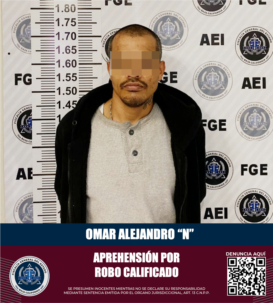 TIJUANA, B.C. A Omar Alejandro “N”, quien es señalado como probable responsable del delito de robo calificado cometido por dos o más personas, le fue cumplimentada una orden de aprehensión por elementos de la Agencia Estatal de Investigación de la Fiscalía General del Estado.