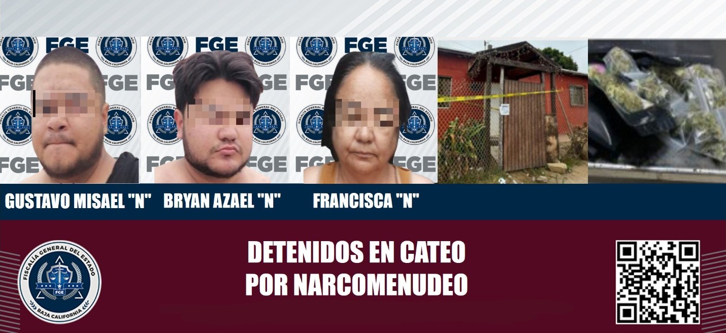 ENSENADA, B.C. Dos hombres y una mujer resultaron detenidos tras el hallazgo de sustancias ilícitas registrado durante un cateo ejecutado por la Fiscalía General del Estado en una vivienda del ex ejido Chapultepec.
