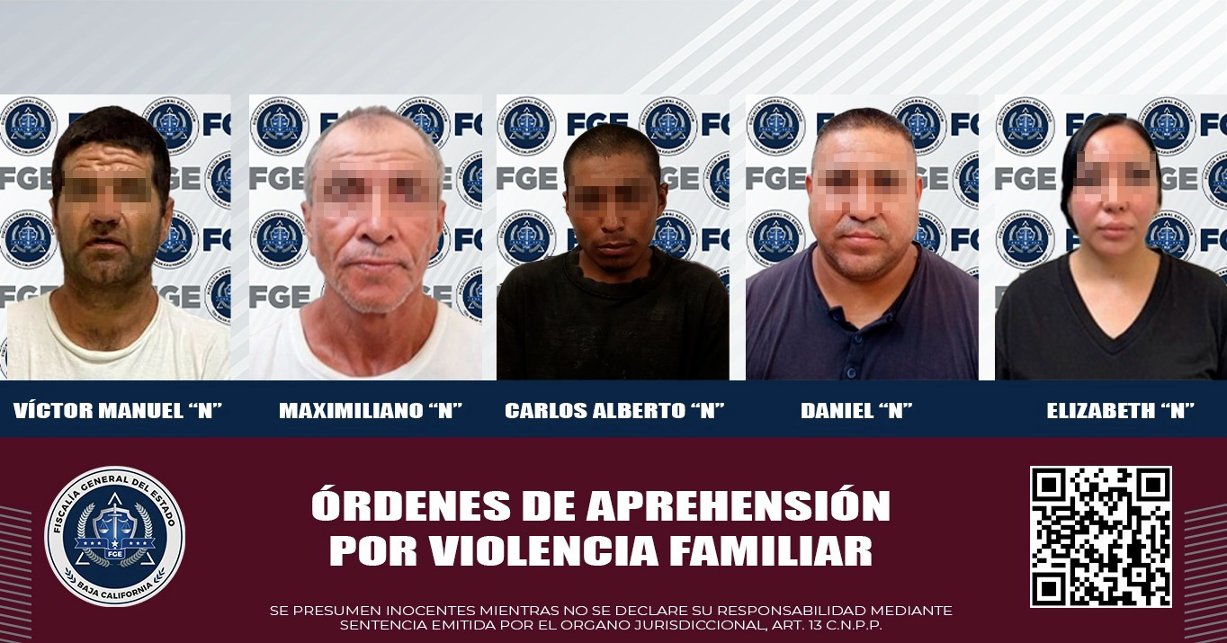 MEXICALI, B.C. Elementos de la Agencia Estatal de Investigación (AEI) adscritos a la Fiscalía Regional de Mexicali lograron el aseguramiento de cinco sujetos, quienes contaban con mandatos judiciales por agredir a sus familiares.