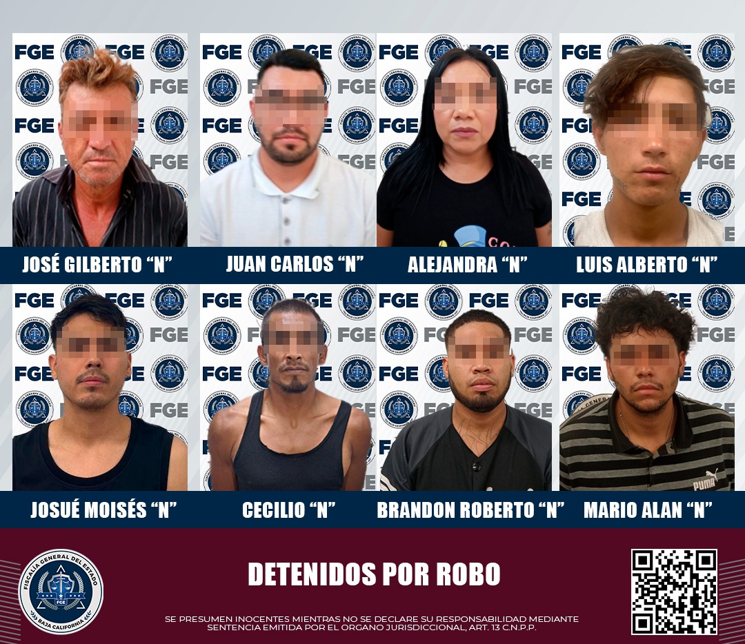 MEXICALI, B.C. Como parte de la estrategia integral contra el delito de robo y sus diferentes modalidades, elementos de la Fiscalía General del Estado (FGE) detuvieron a ocho personas que contaban con mandatos judiciales en su contra.