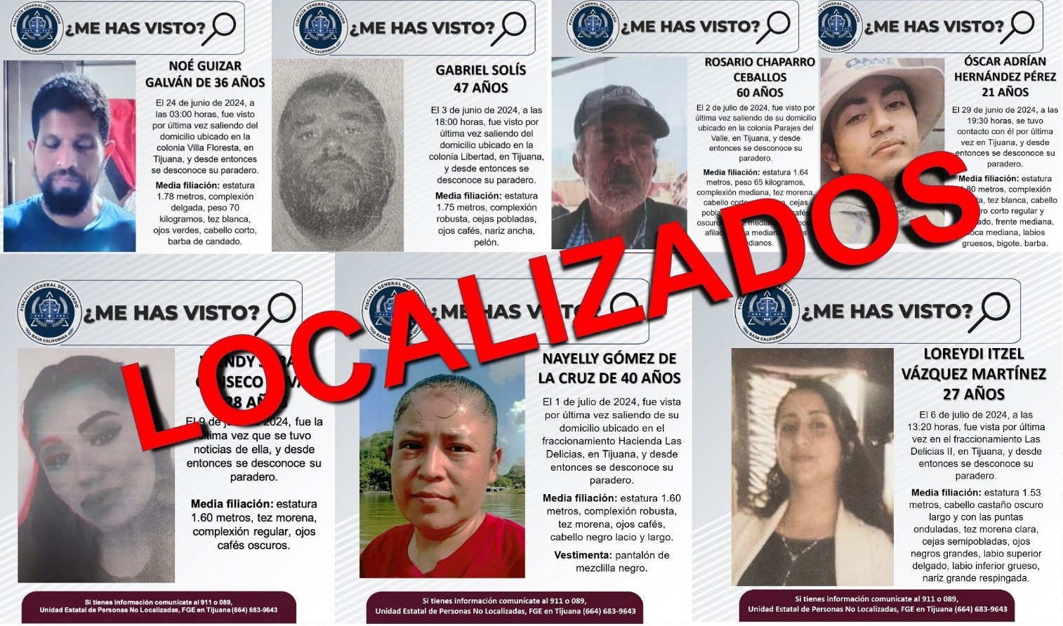 TIJUANA, B.C. Elementos de la Fiscalía General del Estado han localizado a siete personas que habían sido reportadas como desaparecidas, siendo cuatro hombres y tres mujeres, quienes fueron encontradas en buen estado de salud.