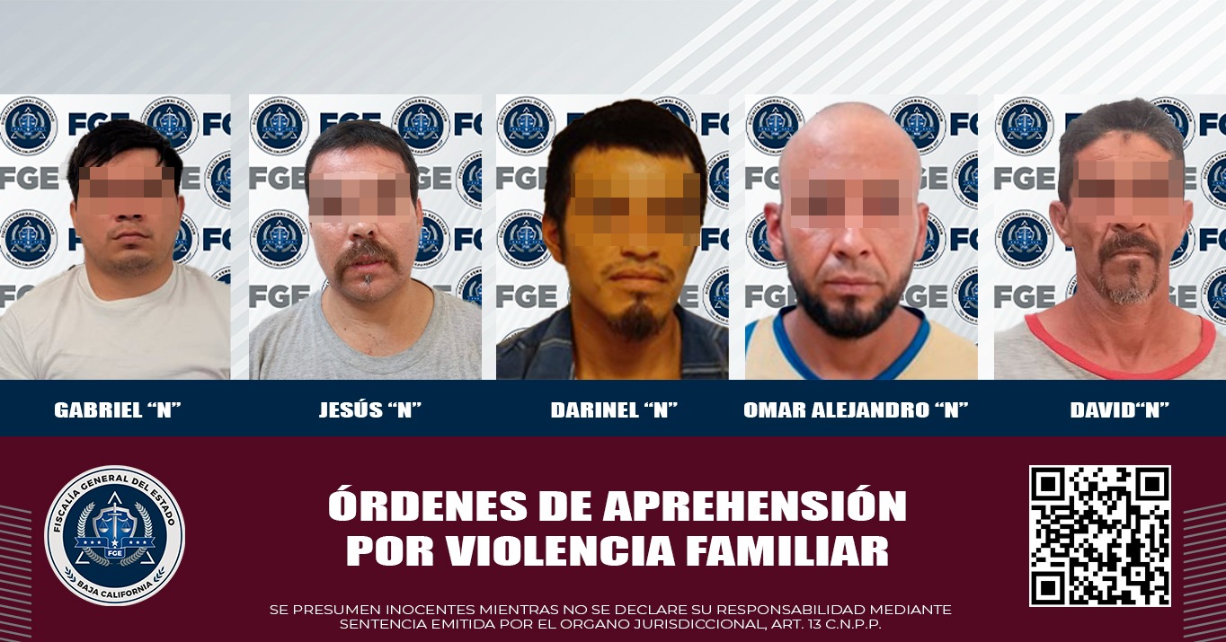 MEXICALI, B.C. Elementos de la Agencia Estatal de Investigación (AEI) adscritos a la Fiscalía Regional de Mexicali lograron el aseguramiento de cinco sujetos, quienes contaban con mandatos judiciales por agredir a sus familiares.