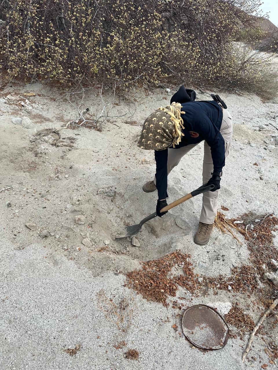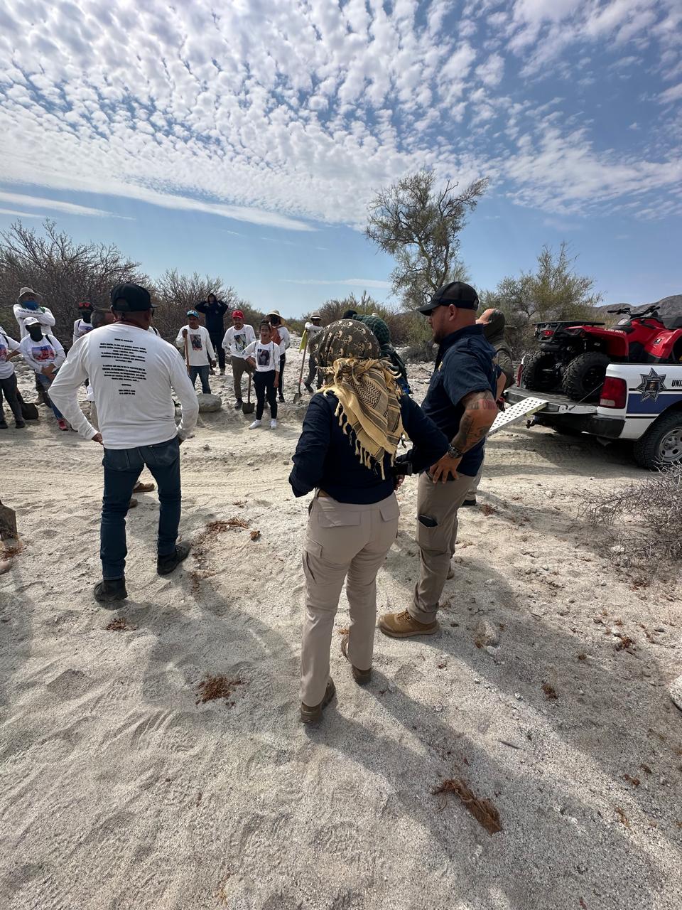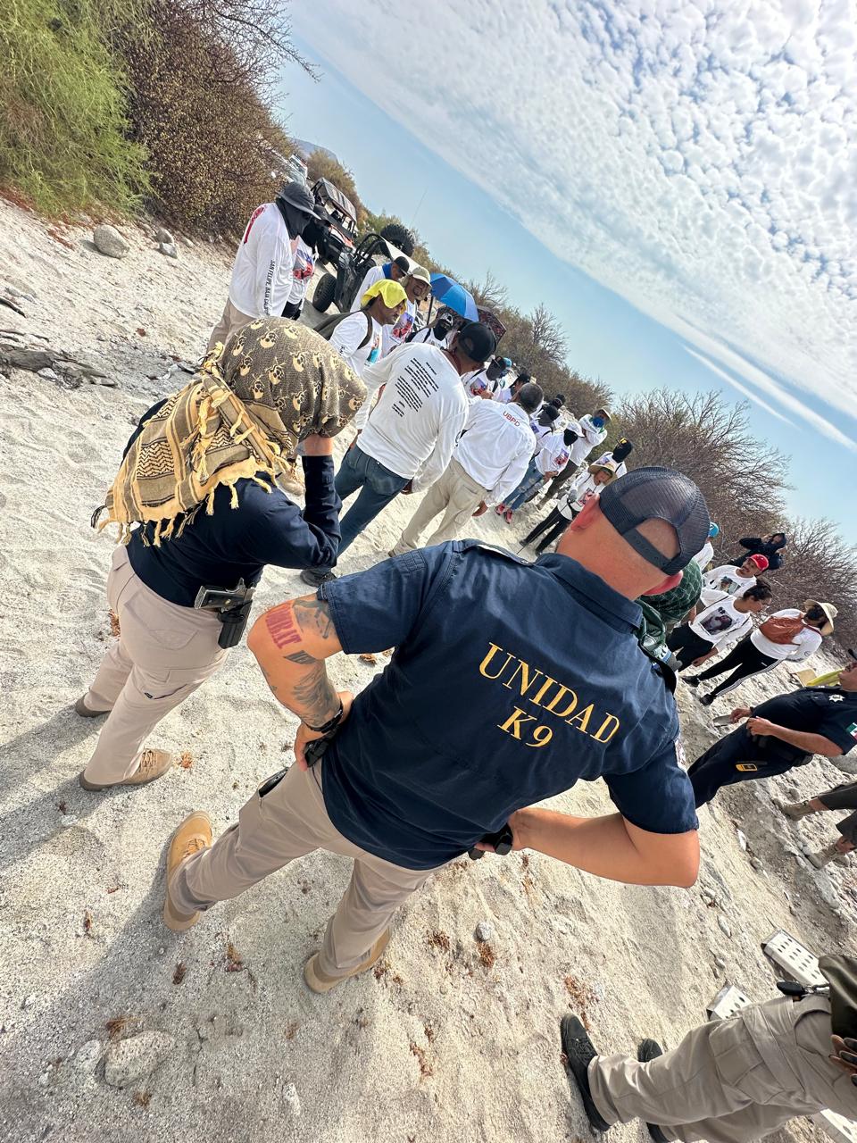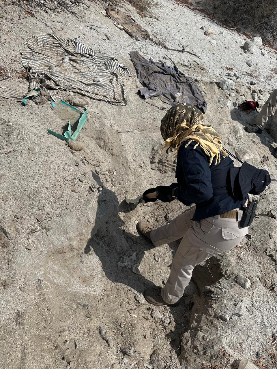 La exploración inició a las 05:00 horas, en la zona desértica al sur del poblado Las Minas, en San Felipe, con apoyo de los binomios K9, Rooster y Coco, especializados en búsqueda y recuperación de cadáveres y restos óseos, se ubicó lo que parecer son huesos largos, por lo que se aplicó el protocolo al cerrar el cuadrante.