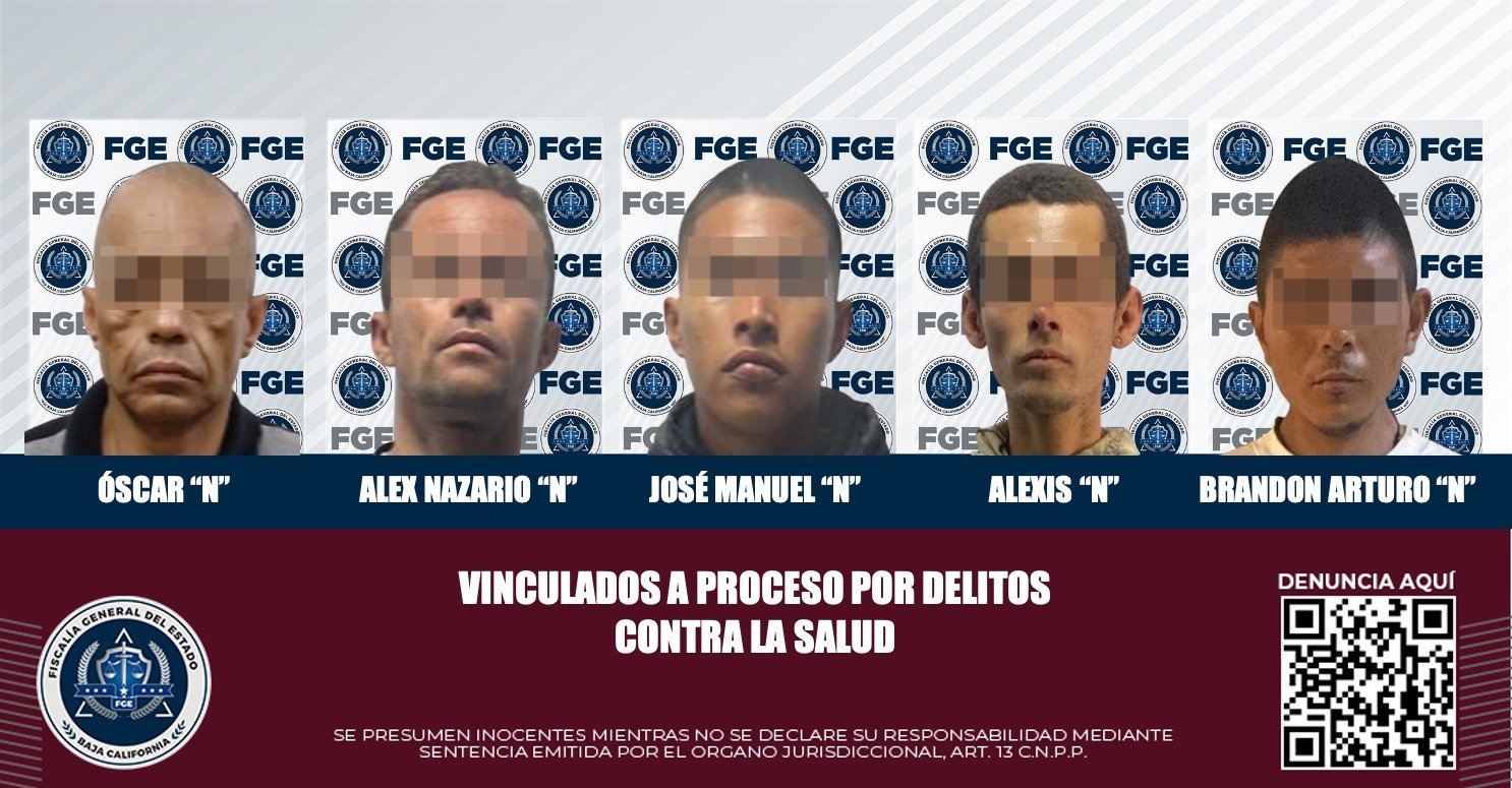 TIJUANA, B.C. La Fiscalía General del Estado informa que cinco imputados por delitos contra la salud han sido vinculados a proceso penal, gracias a la presentación de elementos de prueba por parte del Ministerio Público de la Fiscalía Especializada en Narcomenudeo.