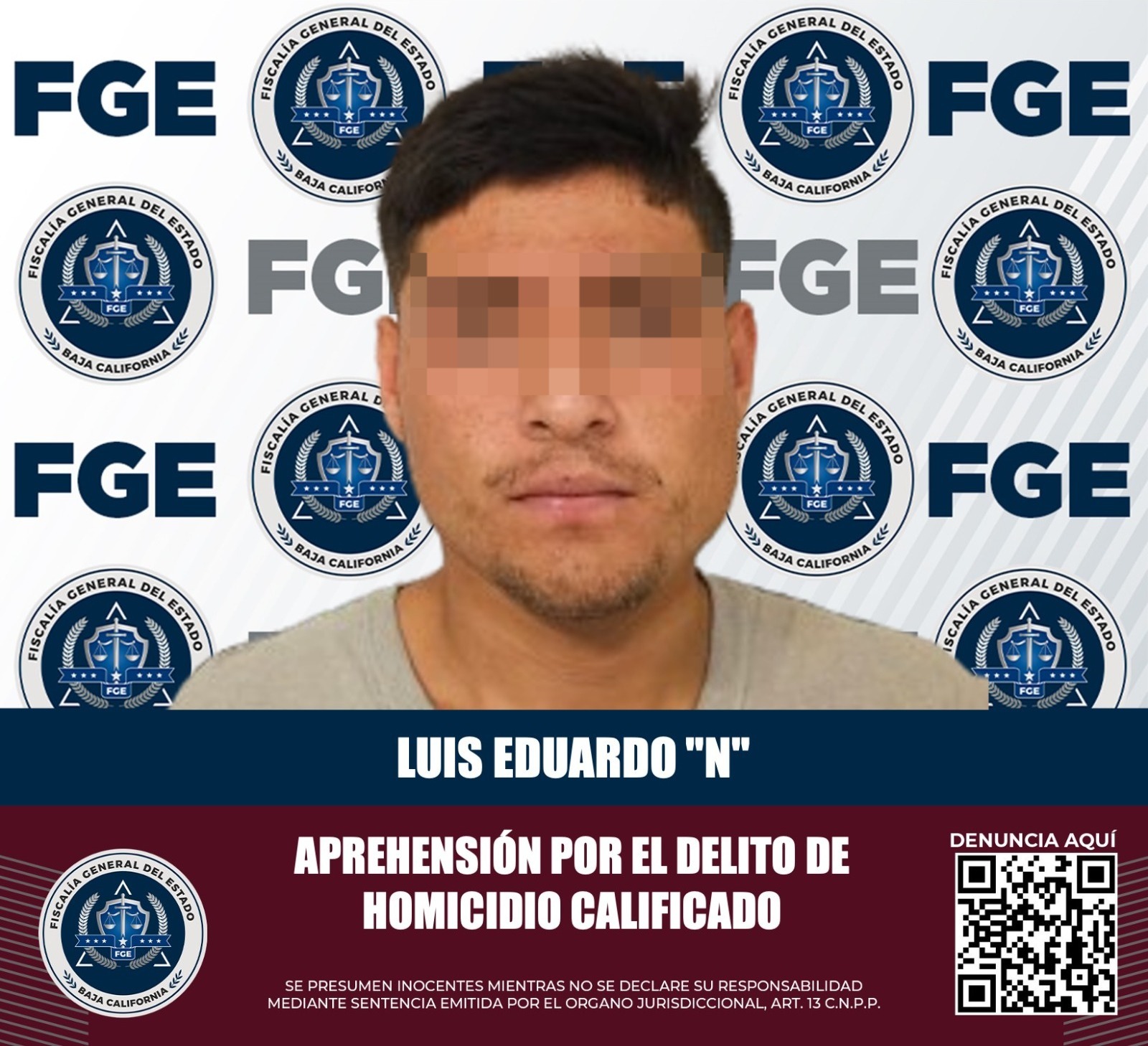 TIJUANA, B.C. La Fiscalía General del Estado de Baja California informa que, como resultado del trabajo de inteligencia de la Agencia Estatal de Investigación, se logró la detención de Luis Eduardo "N", quien contaba con una orden de aprehensión por su presunta participación en el homicidio de Juan Manuel Reyes, ocurrido el 8 de mayo de 2024 en el fraccionamiento Presidentes de Tijuana.
