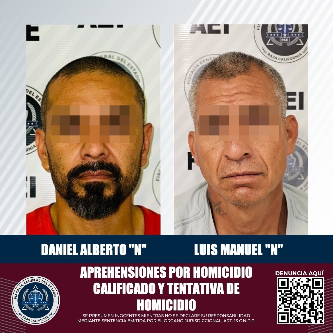 TIJUANA, B.C. La Fiscalía General de Baja California, a través de la Agencia Estatal de Investigación (AEI), ha logrado la aprehensión de dos individuos, en casos por separado, implicados en un caso de homicidio en grado de tentativa, y otro por homicidio calificado y homicidio calificado en grado de tentativa.