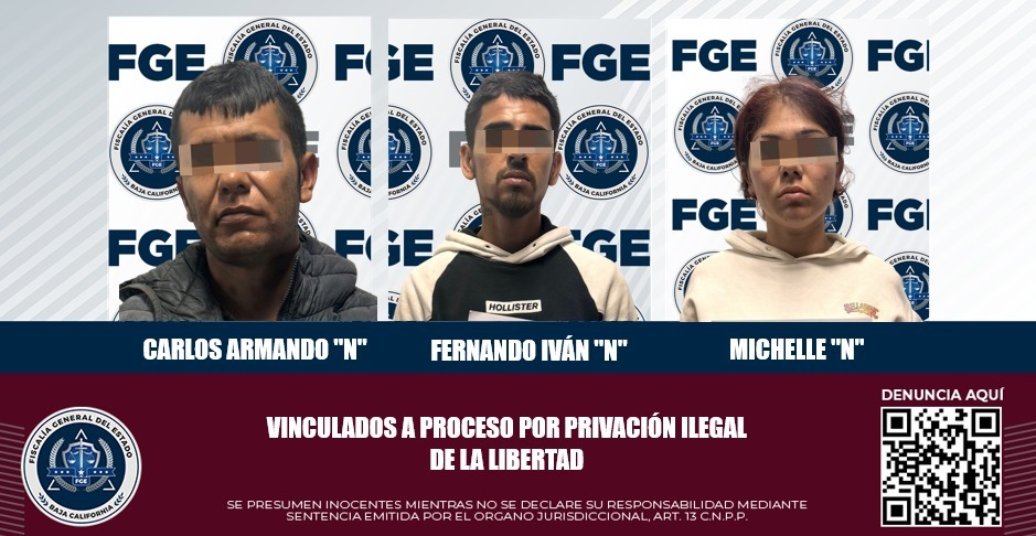 TIJUANA, B.C. La Fiscalía General del Estado de Baja California informa que, tras una exhaustiva investigación y trabajo coordinado con la Fuerza Estatal de Seguridad Ciudadana, se logró la detención y vinculación a proceso de tres individuos implicados en el delito de privación ilegal de la libertad agravada.