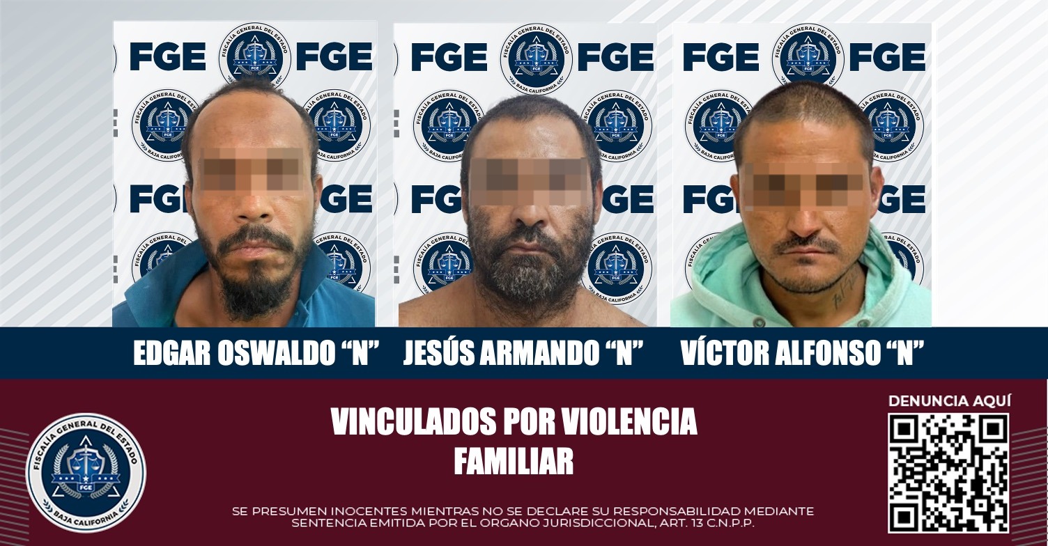 MEXICALI, B.C. Tres hombres fueron vinculados a proceso, por su presunta participación en el delito de violencia familiar, con base al trabajo realizado por la Fiscalía Regional de Mexicali, a través de la Unidades de Investigación con Detenidos Oriente y Foránea de Guadalupe Victoria.