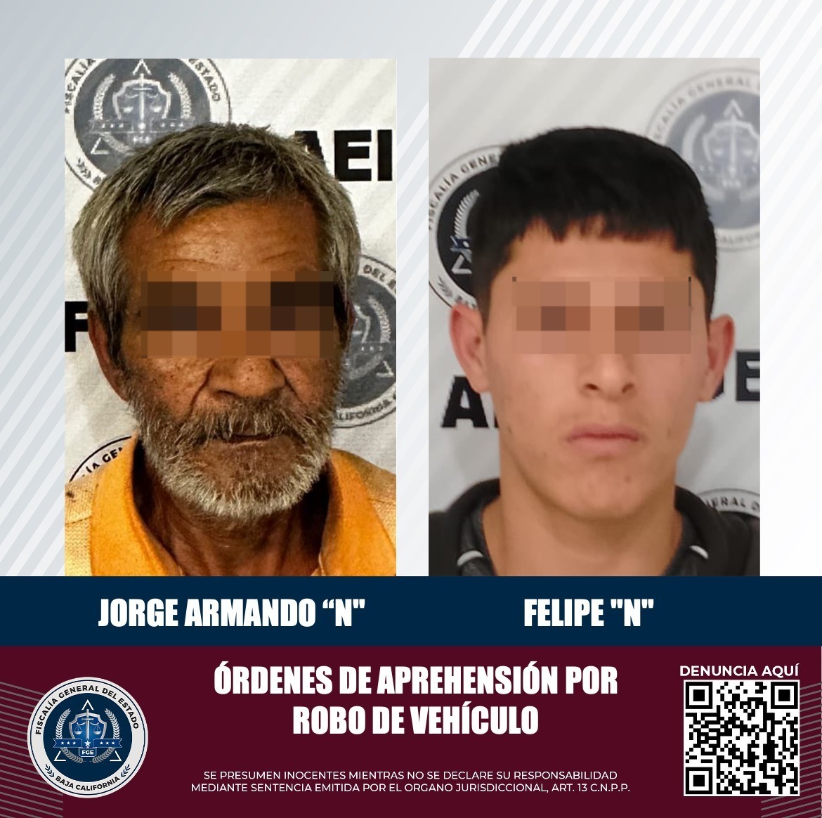 TIJUANA, B.C. Agentes de la Fiscalía General del Estado (FGE) lograron la cumplimentación de dos órdenes de aprehensión por el delito de robo equiparado de vehículo de motor, en su modalidad de poseer vehículo de motor robado.