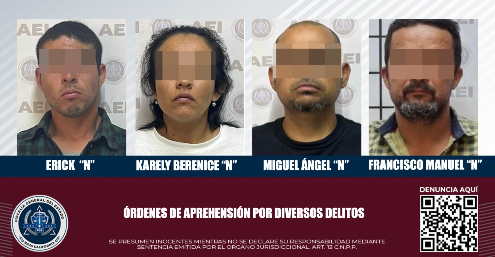 ENSENADA, B.C. La Fiscalía General del Estado, a través de agentes estatales de investigación, cumplimentó cuatro órdenes de aprehensión contra tres hombres y una mujer por robo y otros delitos.