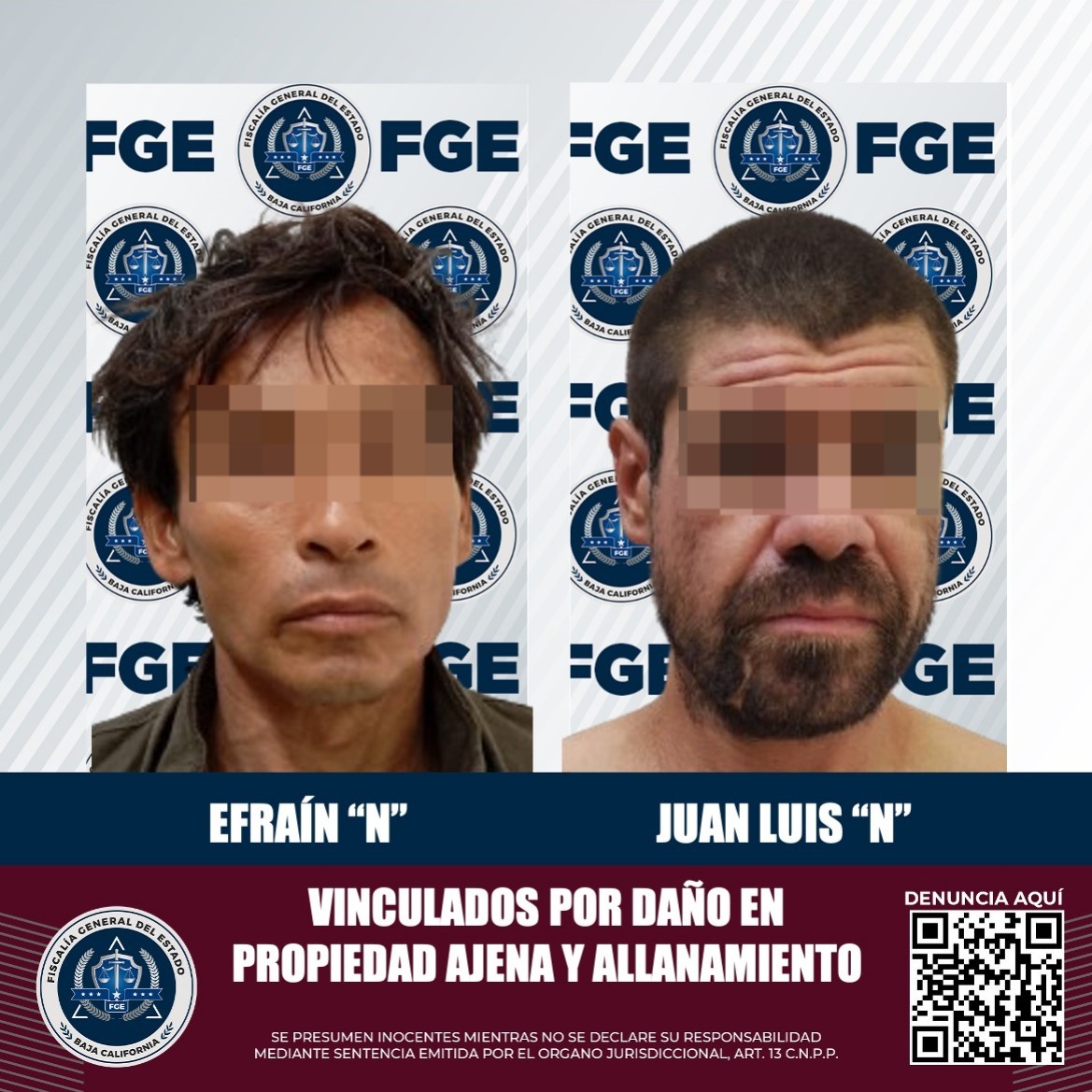 MEXICALI, B.C. La Fiscalía Regional de Mexicali, a través de la Unidad de Investigación con Detenido Poniente, obtuvo la vinculación en audiencias por separado, de dos acusados por los delitos de daño en propiedad ajena y allanamiento.
