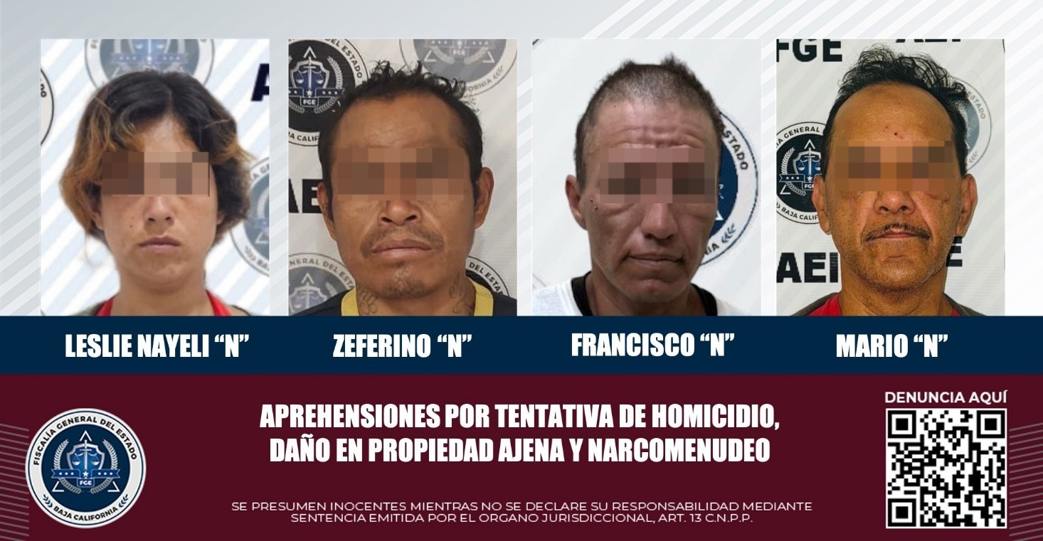TIJUANA, B.C. La Fiscalía General del Estado, logró la detención de cuatro imputados, entre ellos una mujer, quienes contaban con orden de aprehensión activa, en casos diversos, por los delitos de homicidio calificado en grado de tentativa, daño en propiedad ajena y narcomenudeo.