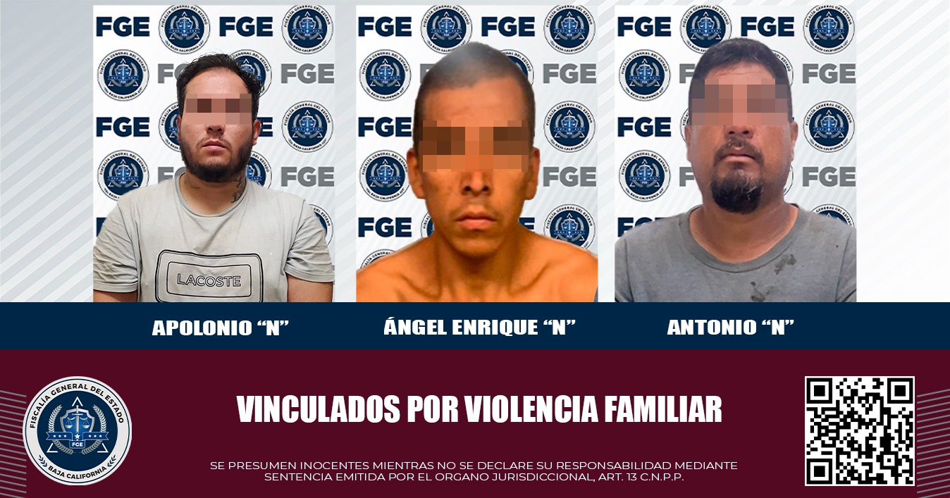 MEXICALI, B.C. La Fiscalía General del Estado, cumpliendo con el compromiso de proteger a la mujer que se encuentra en riesgo de sufrir algún tipo de agresión física y psicológica, obtuvo la vinculación a proceso en contra de tres sujetos por el delito de violencia familiar durante audiencias por separado.