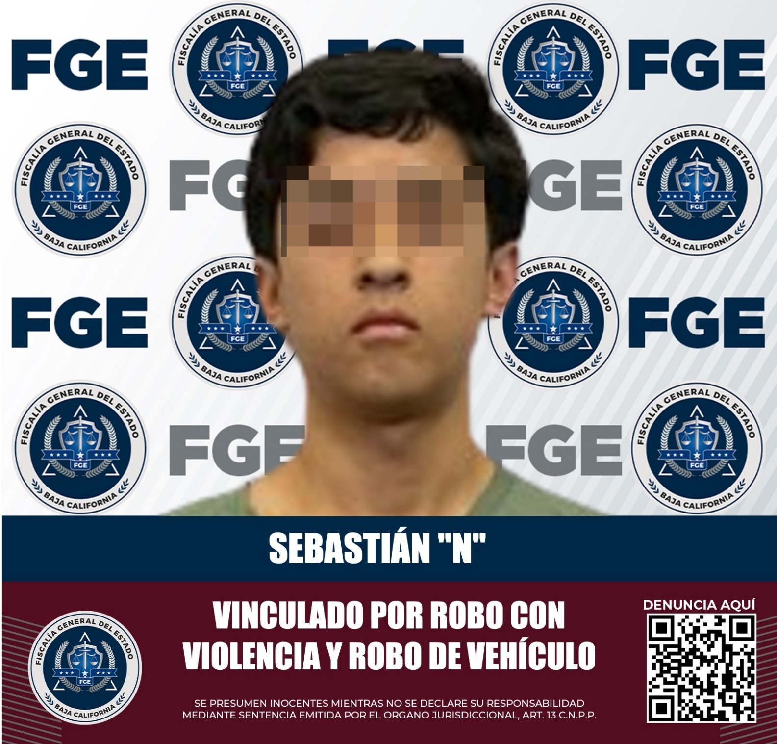 MEXICALI, B.C. Por los delitos de robo calificado a lugar cerrado y robo con violencia, así como robo de vehículo, la Fiscalía Regional de Mexicali obtuvo auto de vinculación a proceso y medida cautelar de prisión preventiva justificada en contra de un joven, considerado objetivo prioritario.