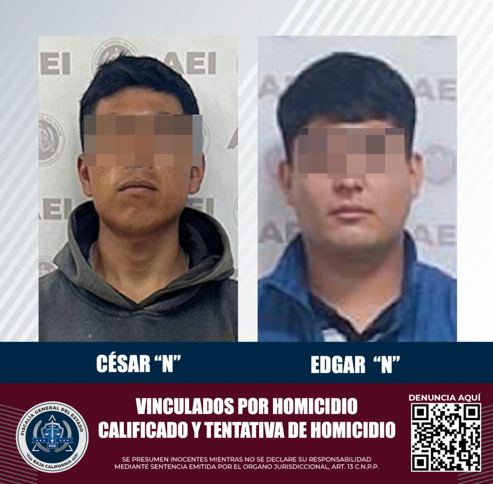 Como resultado de las investigaciones realizadas por la Fiscalía Especializada en Delitos Contra la Vida, el par de presuntos homicidas, Edgar “N” y César “N”, fueron detenidos por Agentes Estatales de Investigación los días 5 y 6 de agosto del año en curso, dando cumplimiento a órdenes de aprehensión por los delitos de homicidio calificado y homicidio calificado en grado de tentativa.