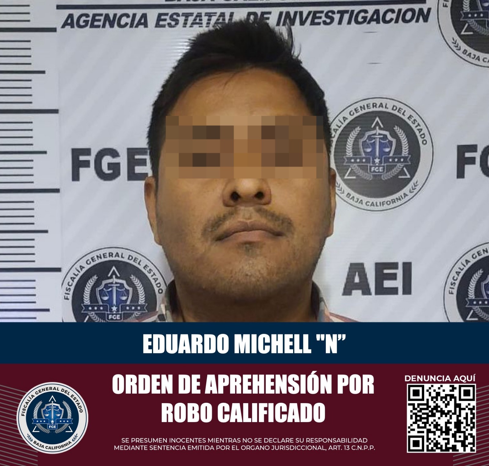 TIJUANA, B.C. Un hombre que está presuntamente implicado en el delito de robo calificado cometido a establecimiento comercial abierto al público, fue detenido con orden de aprehensión por elementos de la Agencia Estatal de Investigación (AEI), de la Fiscalía General del Estado (FGE).
