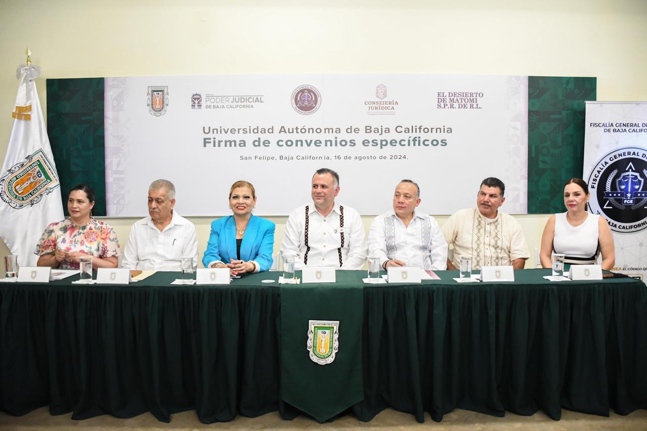 Además de la Coordinadora General de Vinculación y Cooperación Académica, Martha Ofelia Lobo Rodríguez; la Directora de la Facultad de Derecho campus Mexicali, Ana Edith Canales Murillo y el representante legal de la Cooperativa El Desierto de Matomi, José Gómez Amador.