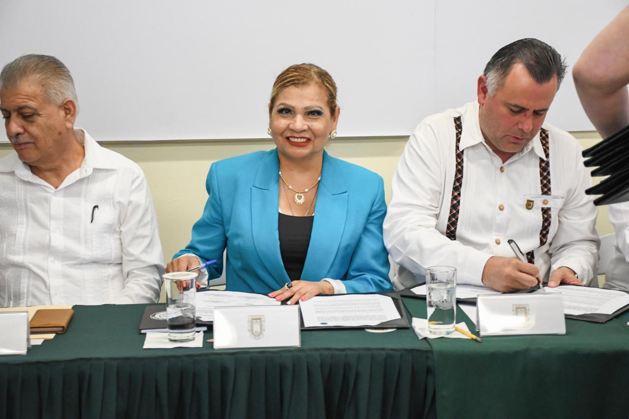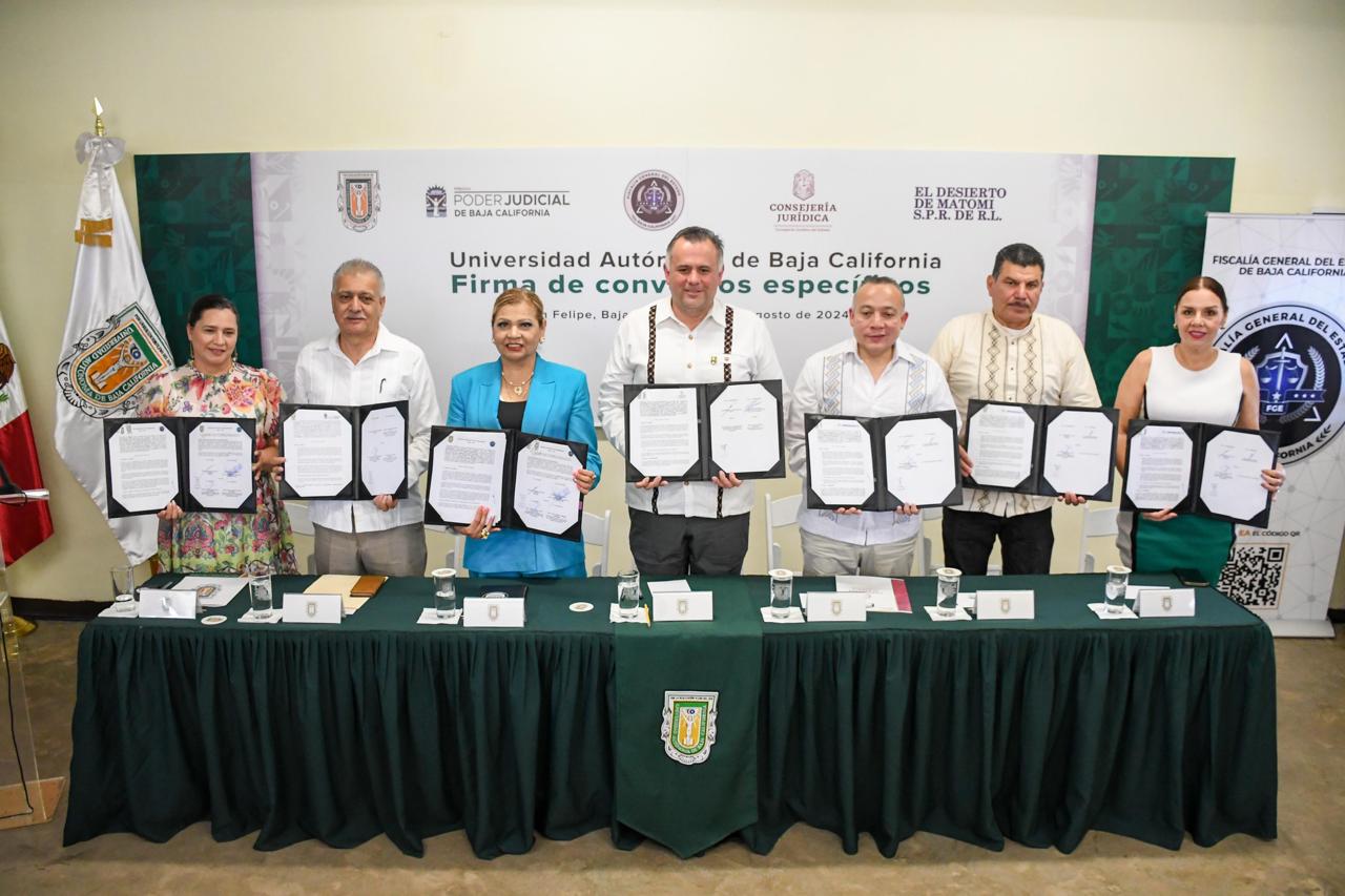 SAN FELIPE, B.C. La Fiscal General Ma. Elena Andrade Ramírez y el Rector de la Universidad Autónoma Baja California Luis Enrique Palafox Maestre firmaron un convenio de colaboración de formación profesional por proyectos.
