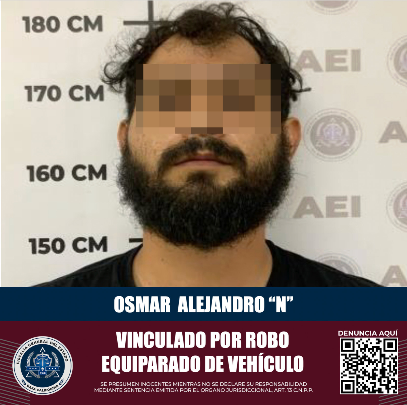 SAN QUINTÍN, B.C. Por medio de diversos datos de prueba, la Fiscalía Regional de San Quintín obtuvo la vinculación a proceso y la medida cautelar de prisión preventiva contra Osmar Alejandro “N” por el delito de robo equiparado de vehículo de motor.