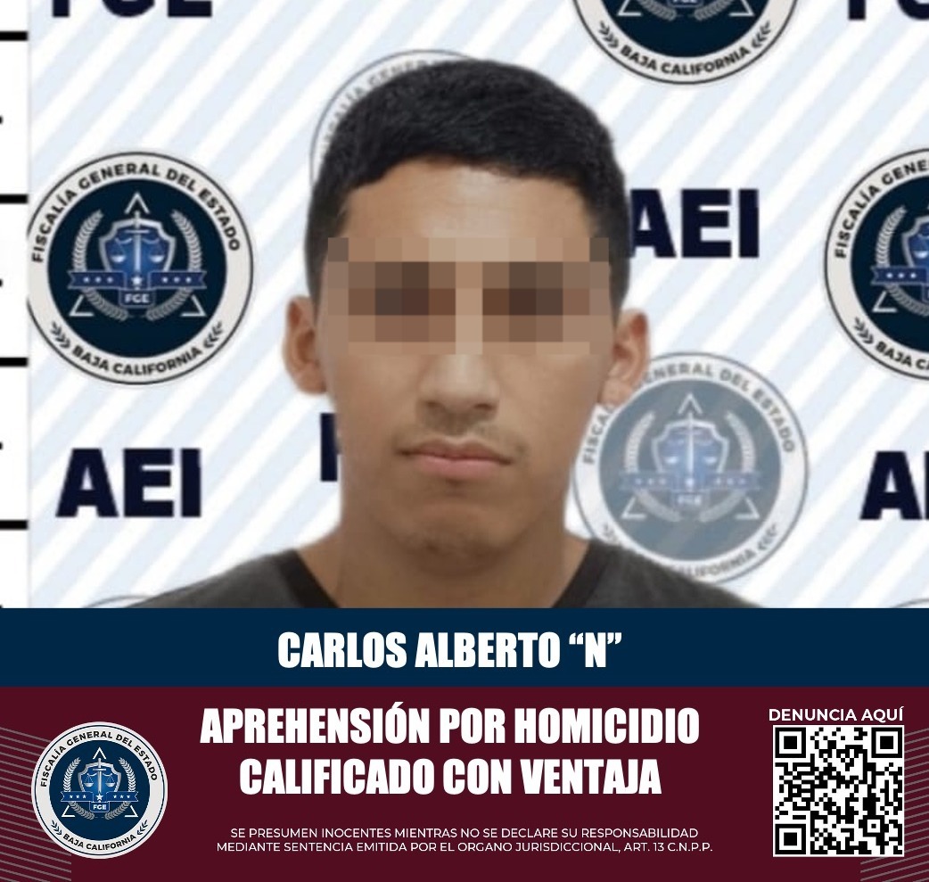 TIJUANA, B.C. La Fiscalía General del Estado (FGE), por conducto de la Agencia Estatal de Investigación, logró la captura de Carlos Alberto “N”, quien es señalado por su probable responsabilidad en el delito de homicidio calificado con ventaja, en hechos ocurridos en julio de 2024.
