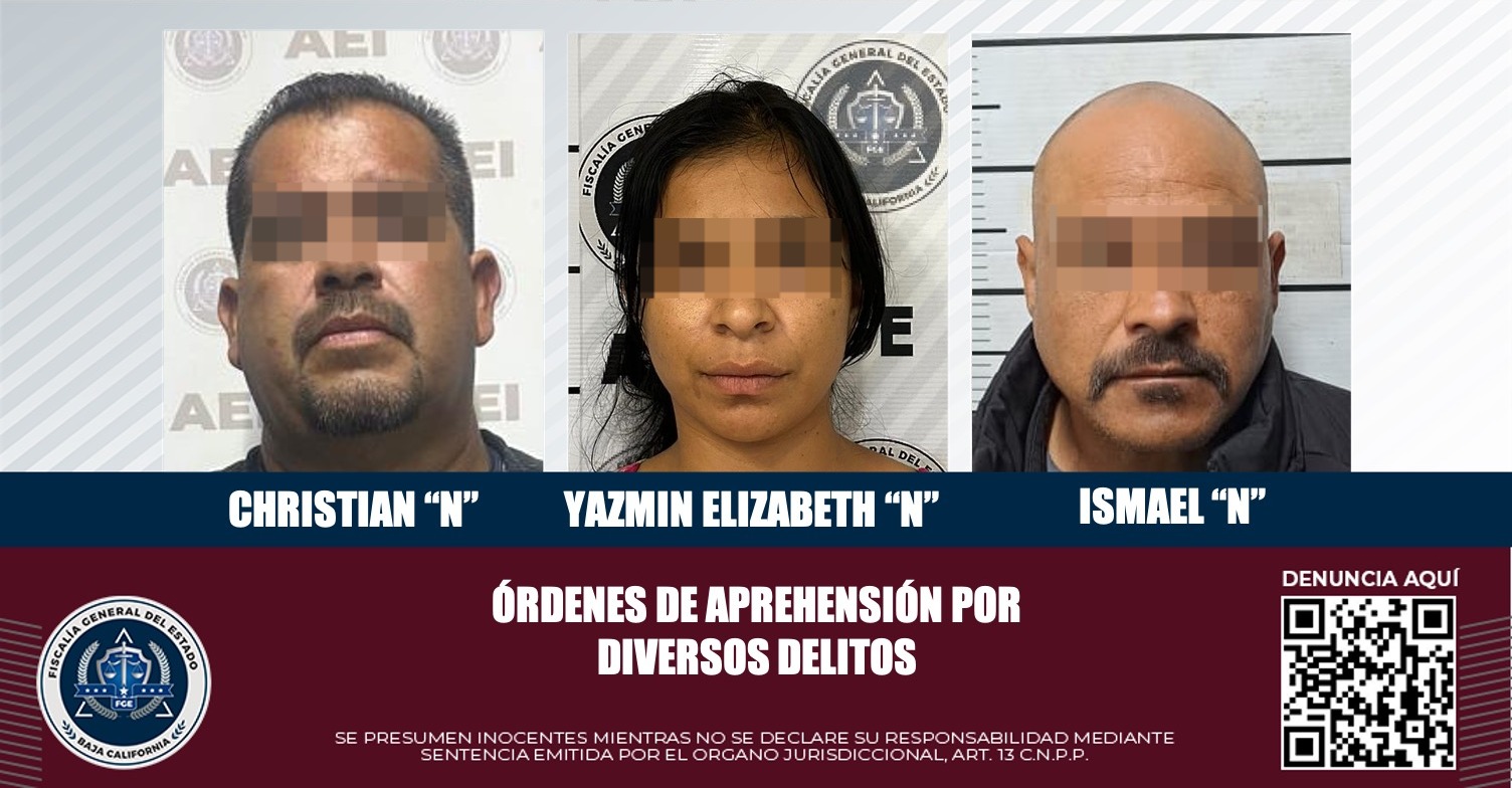 PLAYAS DE ROSARITO, B.C. Tras labor desplegada por agentes estatales de investigación de la Fiscalía General del Estado, se logró detener a tres personas, dos hombres y una mujer, a quienes se les cumplimentó orden de aprehensión, en razón que, en asuntos por separado, están implicados en delitos de fraude, uso de documento alterado y falsedad ante la autoridad, así como por violación y violencia familiar.