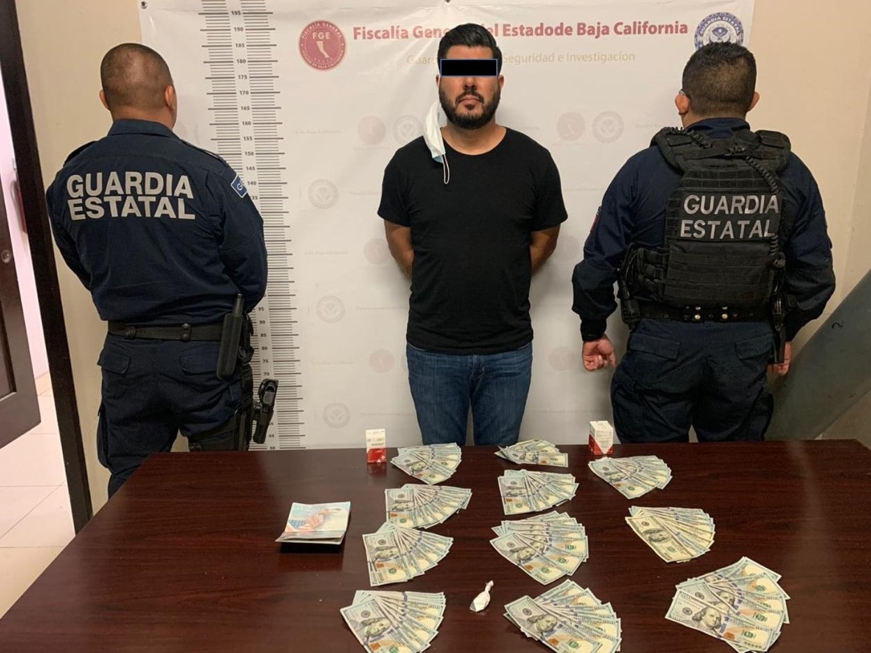 Elementos de la Fiscalía General del Estado (FGE), arrestaron a un individuo en posesión de lo que al parecer es cocaína, medicamento controlado, y 10 mil 400 dólares.