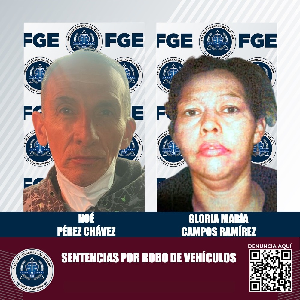 Noé Pérez Chávez fue sentenciado a dos años y un mes de prisión, además de una multa equivalente a 101 Unidades de Medida y Actualización (UMAS), por robo equiparado de vehículo de motor, en la modalidad uso, y por usar placas de un vehículo reportado como robado. Por su parte, Gloria María Campos Ramírez recibió una condena de dos años de cárcel y una multa de 100 UMAS por robo equiparado de vehículo de motor en la modalidad de posesión.