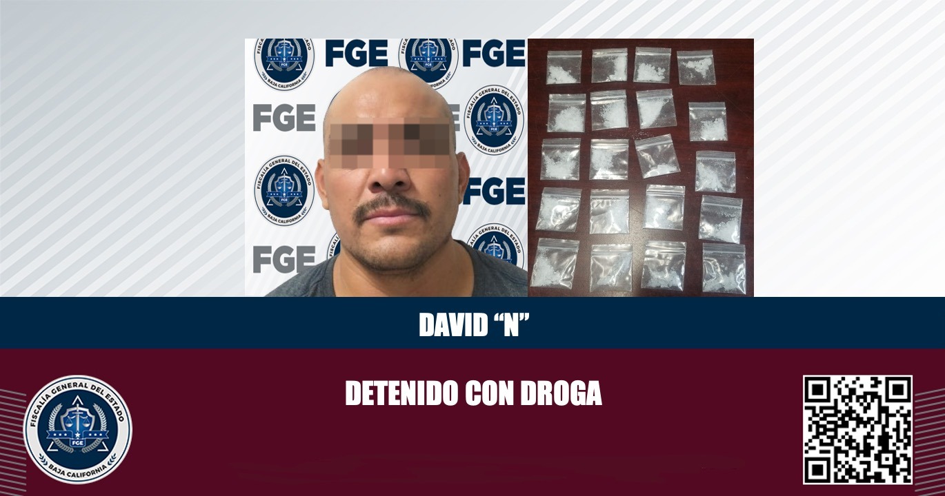 MEXICALI, B.C. Elementos de la Fiscalía General del Estado (FGE), aseguraron en el fraccionamiento Villa Verde, a David “N”, en posesión de 20 bolsas que contenían al parecer de la droga denominada metanfetamina.