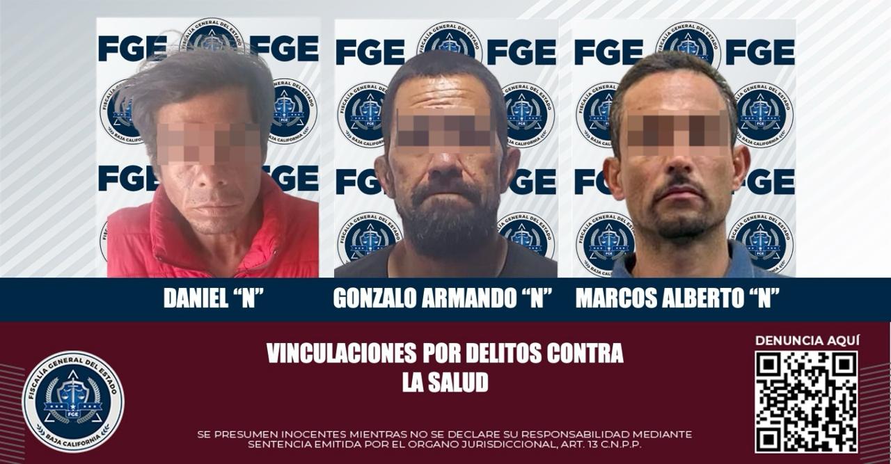 TIJUANA, B.C. En audiencias de vinculación a proceso llevadas a cabo de manera independiente, la Fiscalía General del Estado informa que tres personas acusadas de delitos contra la salud en la modalidad de narcomenudeo han quedado sujetas a proceso penal.