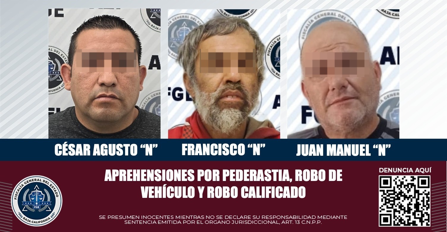 TIJUANA, B.C. La Fiscalía General del Estado detuvo a tres hombres que contaban con orden de aprehensión, como resultado del trabajo en gabinete y campo realizado por detectives de la Agencia Estatal de Investigación (AEI).