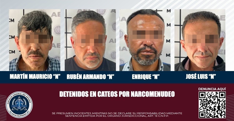 PLAYAS DE ROSARITO, B.C. La Fiscalía General del Estado (FGE) detuvo a cuatro personas durante la realización de dos cateos, atendiendo denuncias de compra y venta de droga al menudeo.