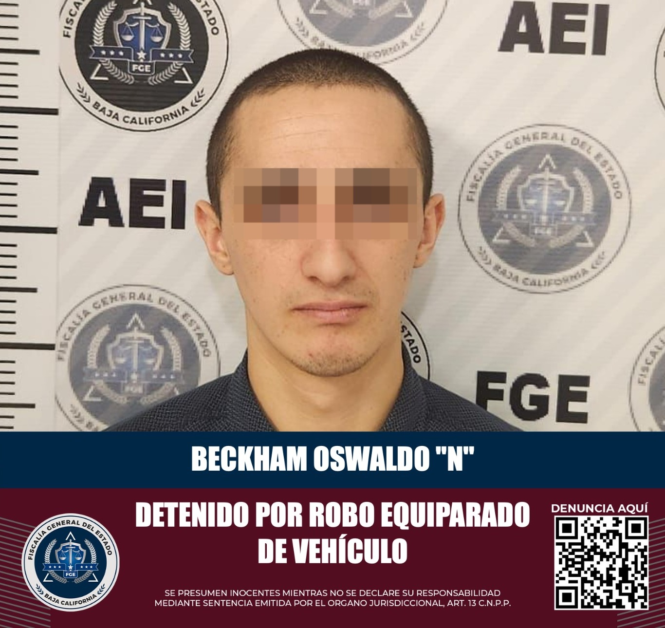 TIJUANA, B.C. La Fiscalía General del Estado, a través de la Agencia Estatal de Investigación (AEI), cumplimentó una orden de aprehensión en contra de Beckham Oswaldo “N”, por el delito de robo equiparado de vehículo de motor, en su modalidad de poseer.