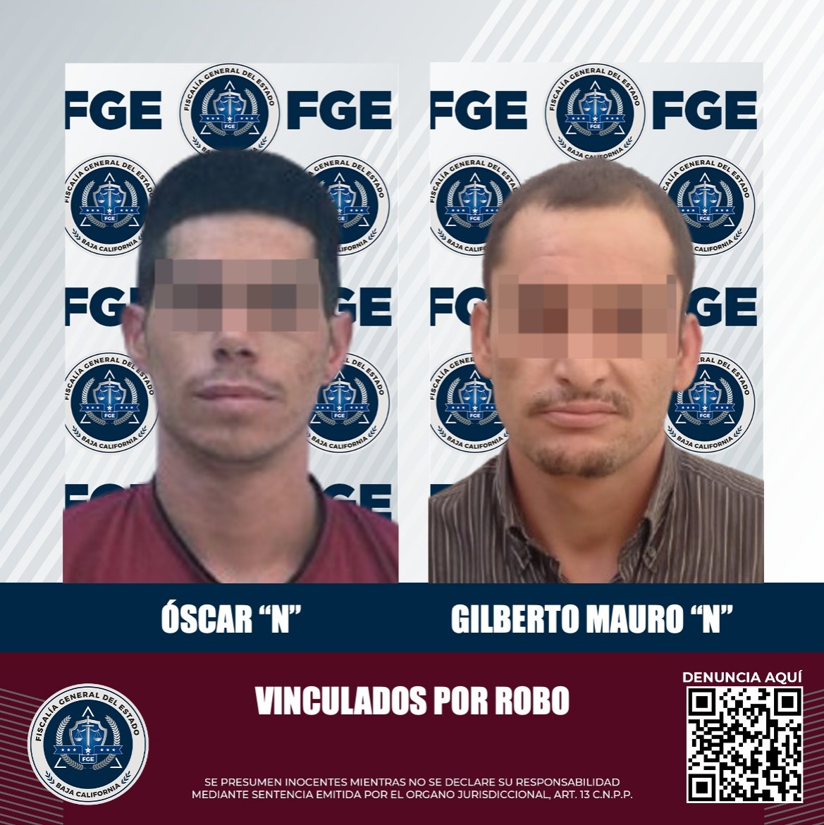MEXICALI, B.C. La Fiscalía Regional de Mexicali, a través de la Unidad de Investigación de Robos Poniente y Detenido Poniente, logró la vinculación de dos hombres relacionados en distintos hechos de robo.